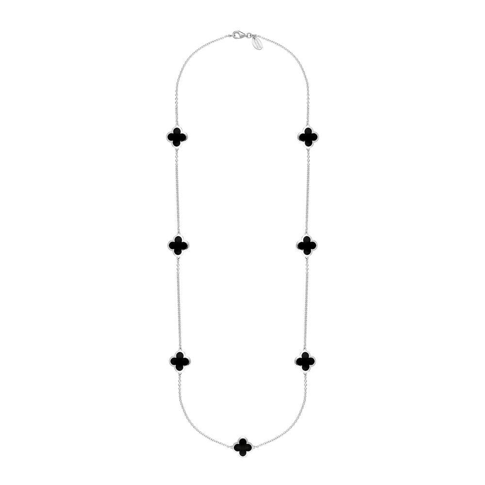 Sterling Silver Whitby Jet Bloom Four Leaf Clover Long Necklace