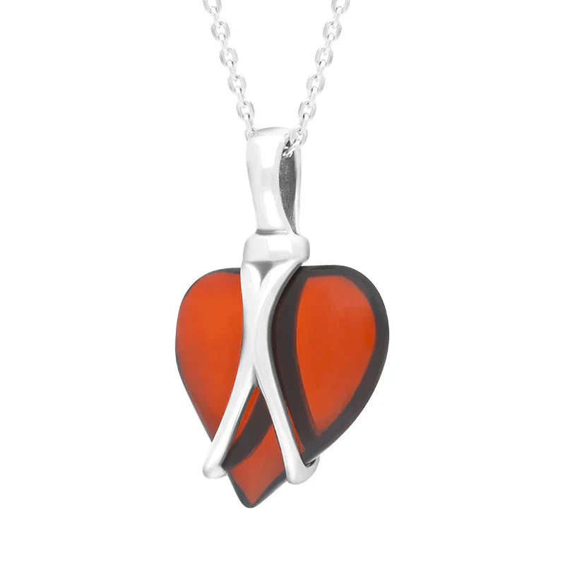 This classic pendant features the finest heart shaped Baltic Amber delicately wrapped in sterling silver. The striking Baltic Amber create a stunning contrast against the sterling silver, making the perfect gift for any Amber lover.
