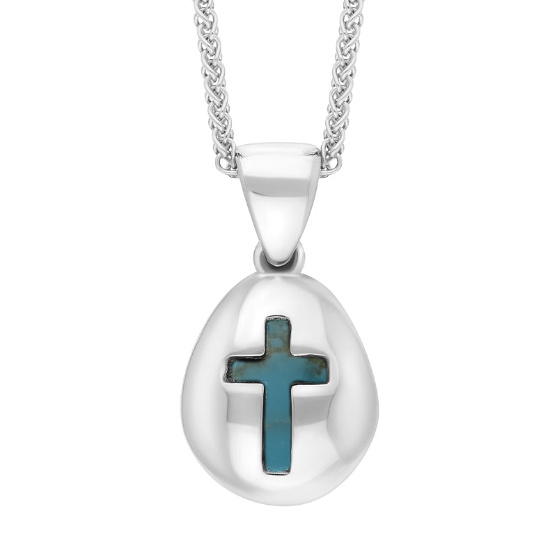 This on-trend sterling silver chain necklace features a petite pear drop encapsulating a fine Turquoise stone completed with a beautiful cross-shaped cutout to the back to show the back of the natural stone.