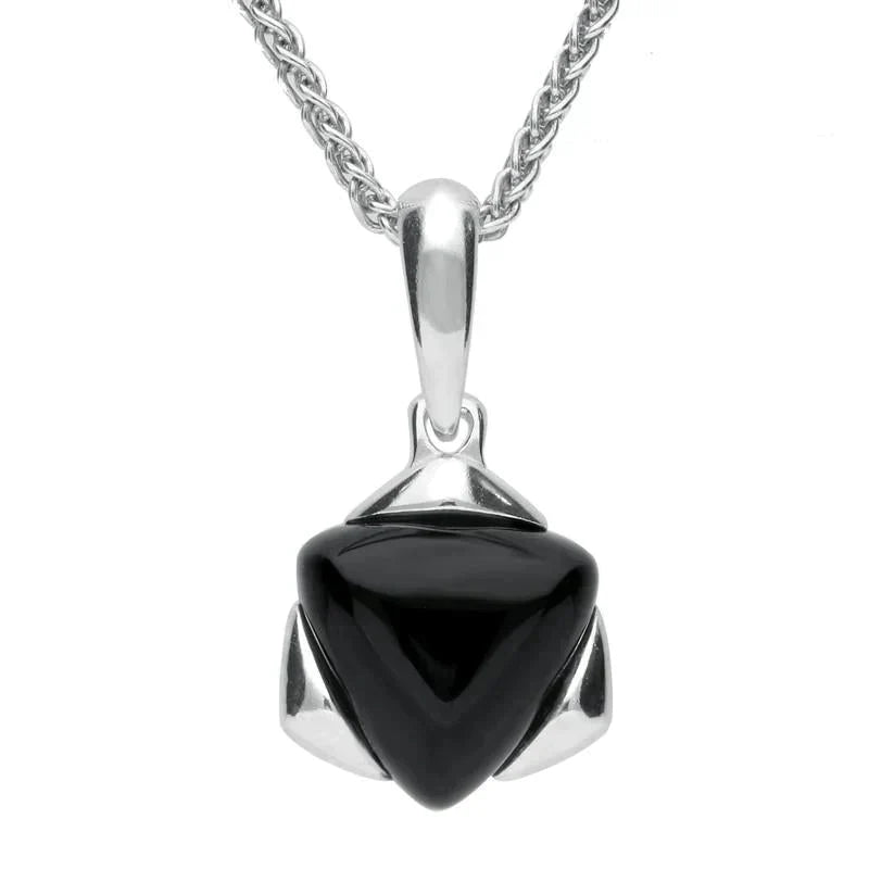 A contemporary and unique pendant features a triangular cabochon of Whitby Jet, cradled beautifully by a modern sterling silver setting. Perfect for any occasion, the pendant hangs gracefully from an 18 inch sterling silver chain.