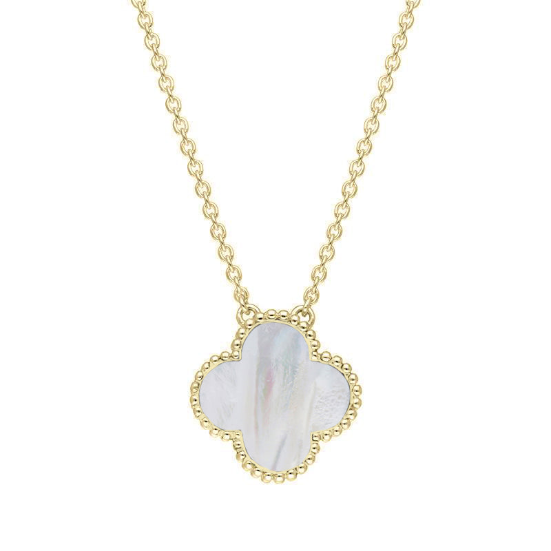 • 18ct Yellow Gold White Mother of Pearl Bloom Large Four Leaf Clover Ball Edge Chain Necklet - N1043 (BLM-420)