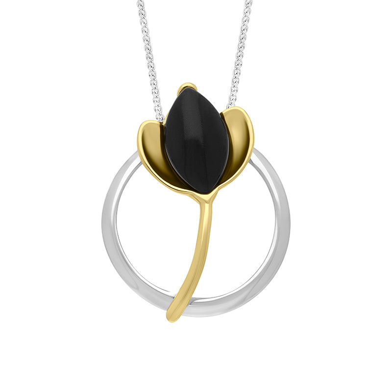 A perfect gift, this necklace features an open circle design, set with hand carved marquise shaped Whitby Jet gemstones upon the leaf. Complete in a sterling silver design with gold plated detailing for a beautiful contrast.
