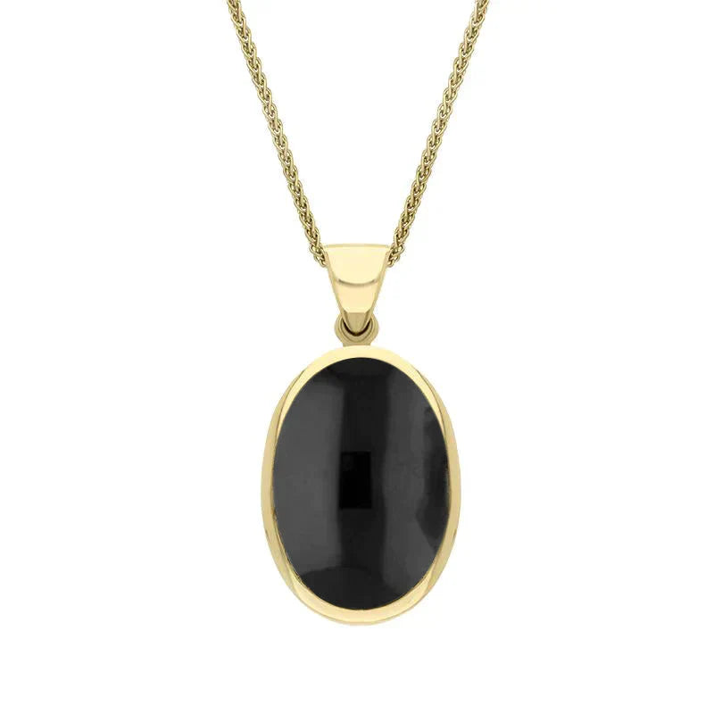 This beautiful double sided fob style necklace features the finest Whitby Jet and Blue John. The hand carved gemstones are flush set into the organic, contemporary oval shape giving a smooth and highly polished finish. Sold complete with an 18 inch 9ct yellow gold chain which fastens with a classic bolt ring style clasp.