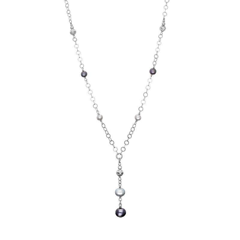 This striking and sophisticated necklace boasts ten unmissable fine pearls in grey and black. The pearls hang from a mesmerising sterling silver link chain meeting in the centre for extra detailing. The necklace is completed by a classic bolt ring clasp for easy wear.