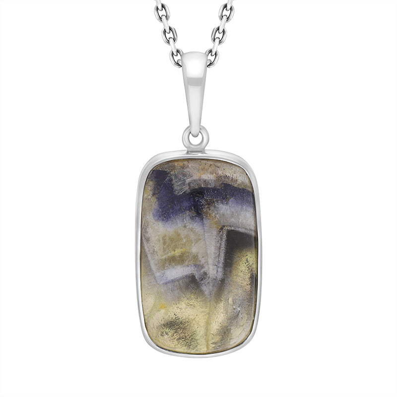 This elegant pendant boasts a stunning abstract shaped cabochon of the finest Blue John stone which has been sourced directly from Castleton, Derbyshire. The gemstone is framed with Sterling Silver, contrasting with the Blue John that creates a piece of jewellery suitable for any occasion.