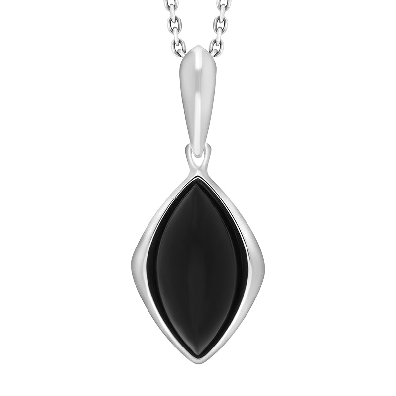 This elegant pendant brought to you by Araucaria has been hand crafted within our workshop by our expert jewellery craftsmen. It features a hand carved marquise Whitby Jet gemstone that is set within a Sterling Silver frame. Perfect for every day wear, this item is accompanied by an 18 inch silver chain.