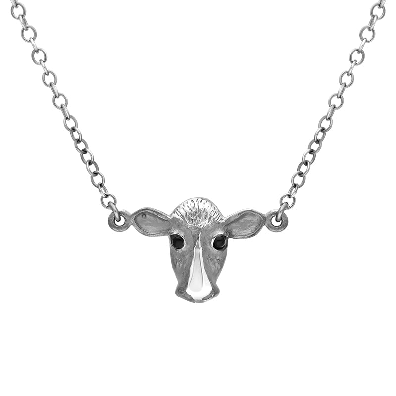 This simple necklet design features a beautiful cow head, with two stunning pieces of Whitby Jet completing the cows face. This sterling silver necklace is 18 inches end to end and fastens with a classic bolt ring style clasp.
