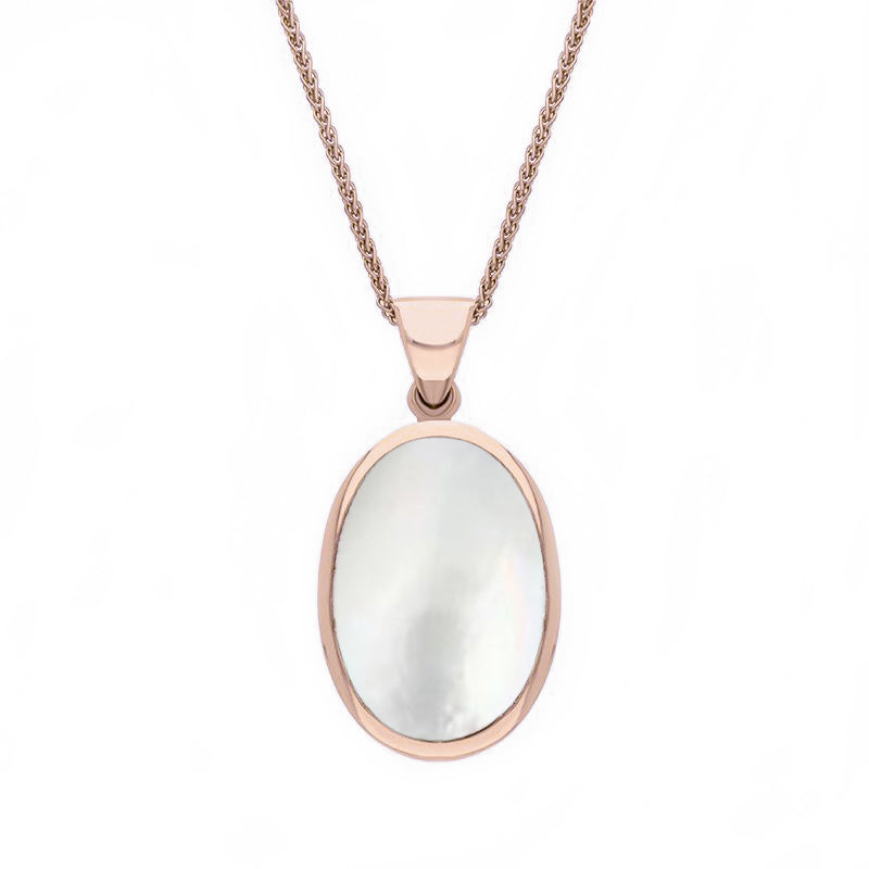 This beautiful double sided fob style necklace features the finest Blue John and White Mother Of Pearl. The hand carved gemstones are flush set into the organic, contemporary oval shape giving a smooth and highly polished finish. Sold complete with an 18 inch 9ct rose gold chain which fastens with a classic bolt ring style clasp.