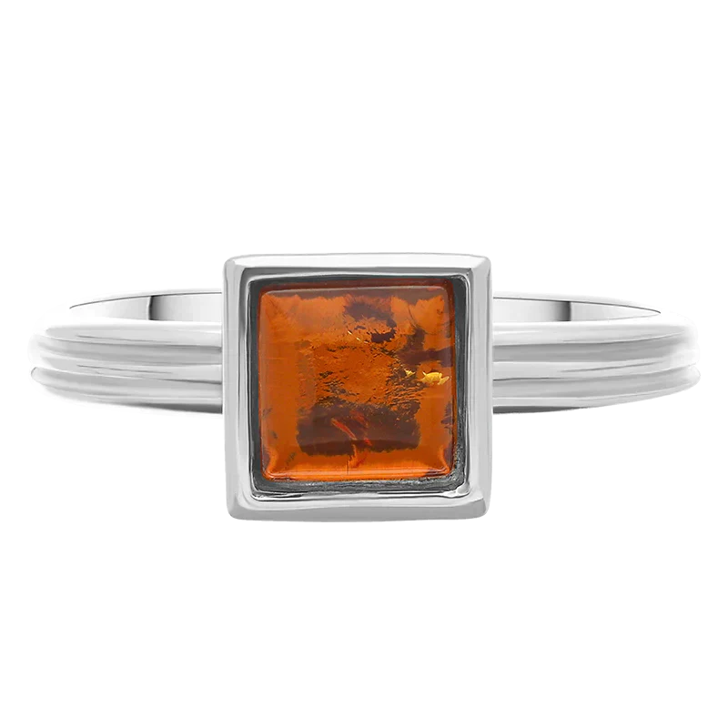 This versatile ring features hand carved natural Baltic Amber. The stunning cabochon is highly polished and set in solid sterling silver for a smooth finish. The style looks modern and on trend stacked with other rings.