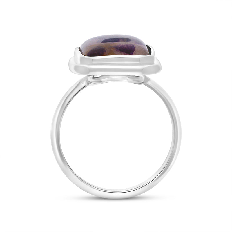 This unique Sterling Silver ring features the finest Blue John doublet, creates a stunning contrast against the silver setting making this piece the perfect ring for any gemstone collector.