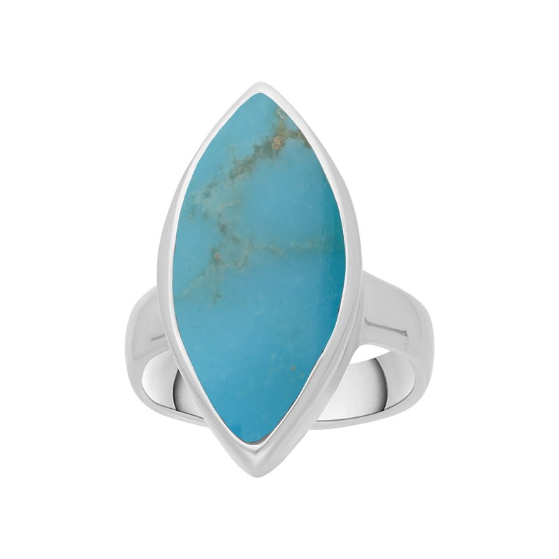 A classic, chunky marquise shaped sterling silver andTurquoise ring. The hand polished marquise shaped Turquoise gemstone sits proudly, making this ring a flattering shape for a multitude of fingers and a popular style choice. This genuine Turquoise gemstone has been sourced directly from the Kingman mine in Arizona.