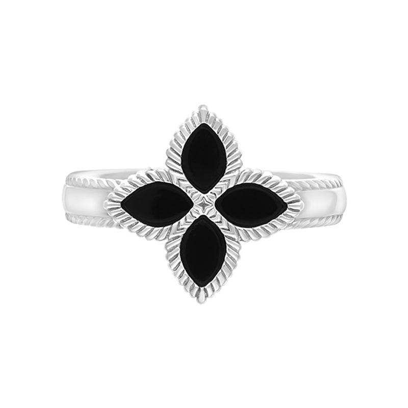 These elegant stud Ring features four stunning marquise shaped cabochons of the finest Whitby Jet stone in the shape of a flower, sourced directly from the north east coast of Yorkshire. The flower is surrounded with a rope edge detail for a unique, stylish finish. The striking Whitby Jet forms a stunning contrast between the sterling silver rope edge frame, creating the perfect look for every occasion. Presented on post and butterfly fitments for secure wear.