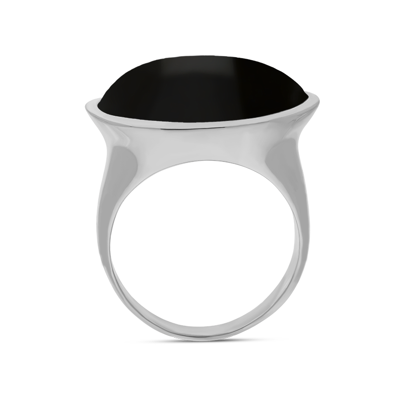 This elegant ring features a stunning oval cabochon of hand carved Whitby Jet which has been sourced directly from the North East Coast of Yorkshire. The gemstone is set within an exquisite sterling silver base and completed with a wide statement sterling silver band.