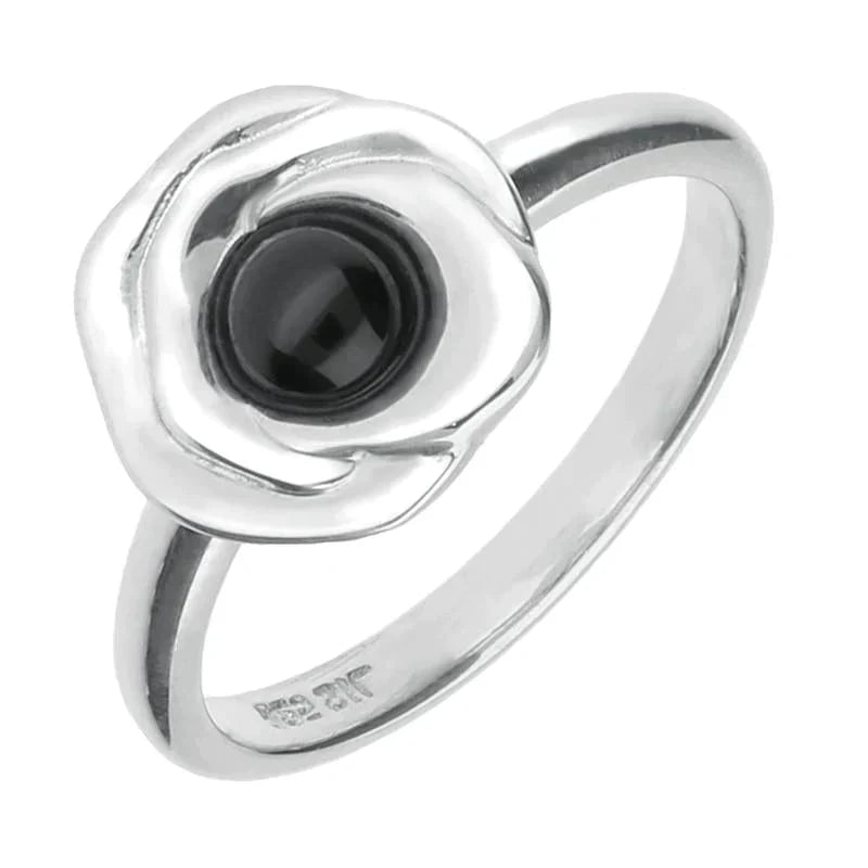 Sterling Silver Whitby Jet Stone Rose Ring, R873.