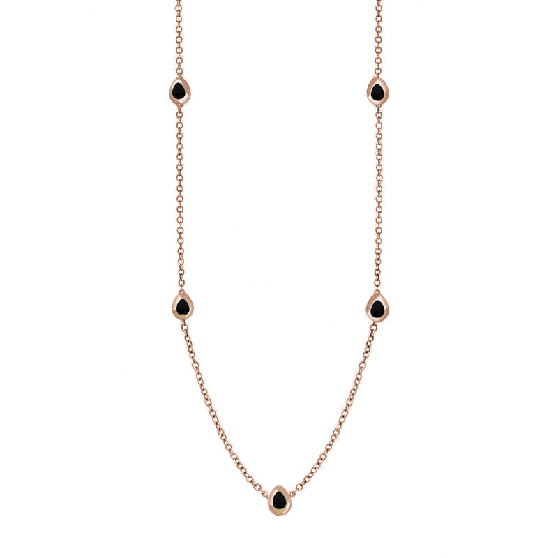 This on trend 18ct rose gold chain necklace features petite discs embellished with cross shaped fine Whitby Jet stones that have been sourced directly from the North East coast of Yorkshire.