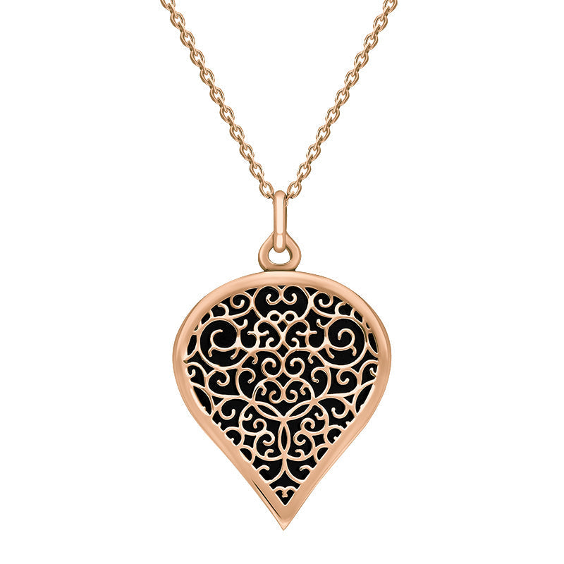 18ct Rose Gold Whitby Jet Flore Filigree Large Heart Necklace. P3631.