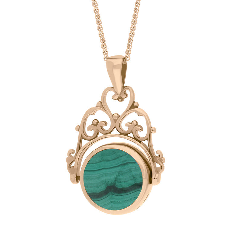 18ct Rose Gold Whitby Jet Malachite Double Sided Round Swivel Fob Necklace