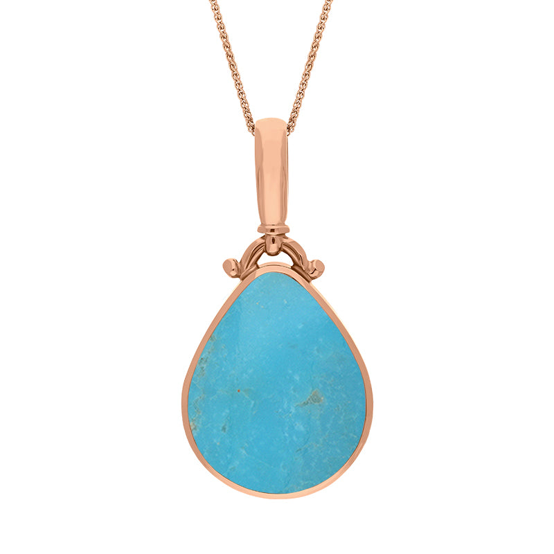 18ct Rose Gold Whitby Jet Turquoise Double Sided Pear Fob Necklace, P056.