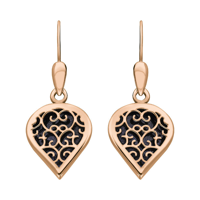 9ct Rose Gold Blue Goldstone Flore Filigree Heart Drop Earrings