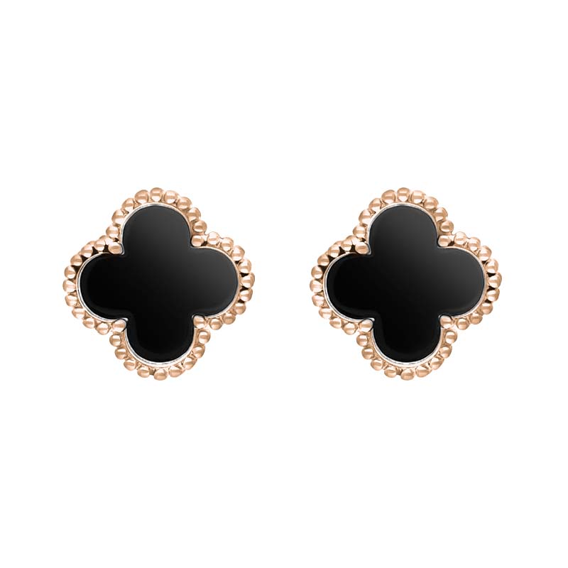 9ct Rose Gold Whitby Jet Bloom Four Leaf Clover Ball Edge Stud Earrings, E2600