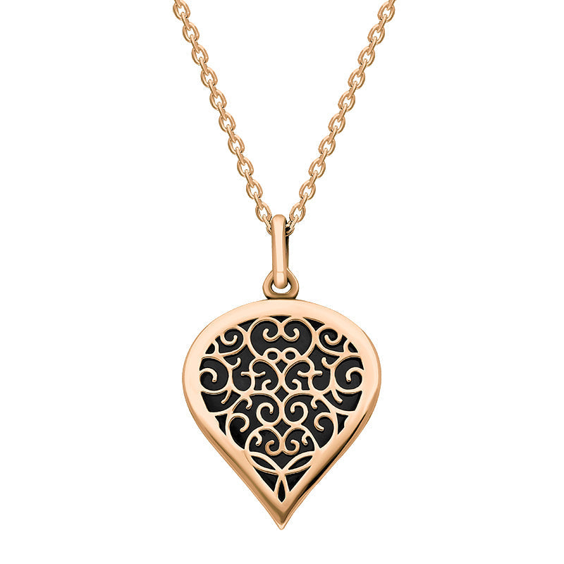 9ct Rose Gold Whitby Jet Flore Filigree Medium Heart Necklace. P3630.