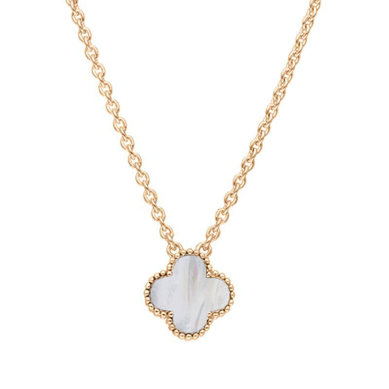 This elegant necklace features a stunning four leaf clover shaped cabochon of the finest Mother of Pearl. The clover is surrounded by a ball edge detail for a unique, stylish finish. The striking Mother of Pearl forms a stunning combination with the 9ct rose gold ball frame, creating the perfect look for every occasion. Presented on an 18 inch long chain.