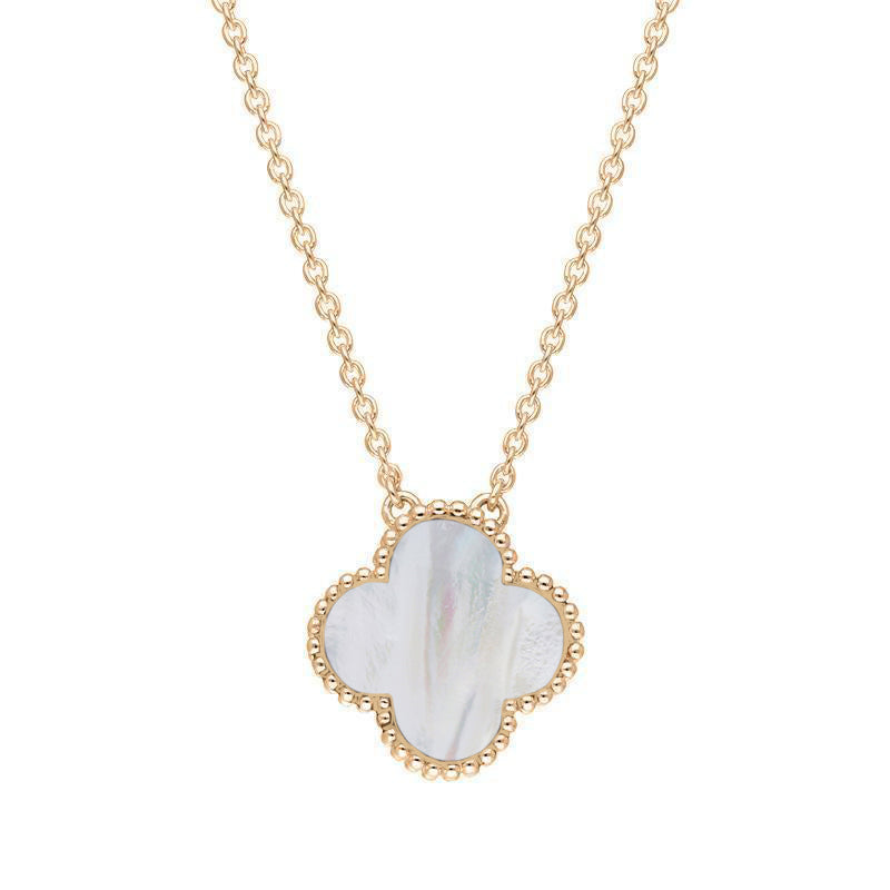 This elegant necklace features a stunning four leaf clover shaped cabochon of the finest Mother of Pearl. The clover is surrounded by a ball edge detail for a unique, stylish finish. The striking Mother of Pearl forms a stunning combination with the 9ct rose gold ball frame, creating the perfect look for every occasion. Presented on an 18 inch long chain.