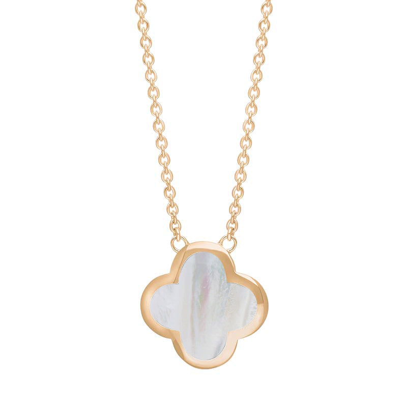 9ct Rose Gold White Mother of Pearl Bloom Large Four Leaf Clover Polished Edge Pendant, N1153