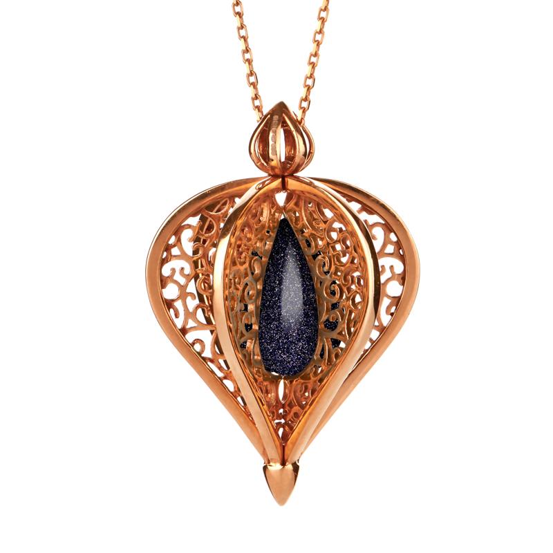 This exquisite necklace is part of Rebecca Sellors' Flore collection. The pendant features a stunning centre of hand polished Blue Goldstone gemstones. Six beautifully crafted rose gold plated sterling silver petals form an elegant chandelier around the centre gemstones. The intricate filigree detail of this design has been created using the latest Laser Sintering Technology. Sold complete with a 30 inch sterling silver chain which fastens with a classic bolt ring style clasp.