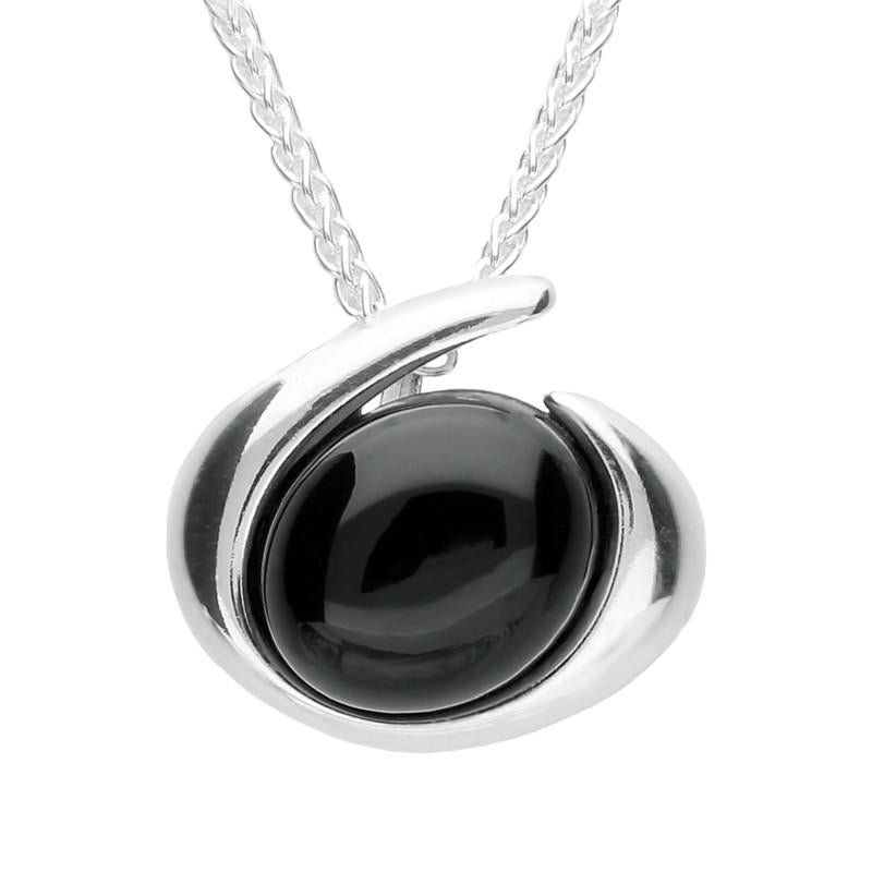 A contemporary design from our workshops which features a hand carved oval Whitby Jet gemstone set in swirling sterling silver frame. Presented on an 18 inch sterling silver chain through silver bail at the top. A modern and stylish addition to any jewellery lovers collection.