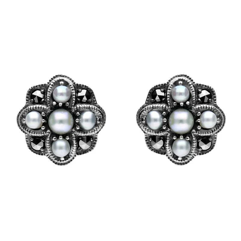 These stylish four petal flower Pearl and Marcasite stud earrings are hand crafted within our workshops by our highly skilled jewellers. Perfectly finished with a vintage look and added elegance from the gemstones. Secured by a silver post and butterfly back fitting. Dimensions: 10mm x 10mm, Pearls: 2mm x 2mm.