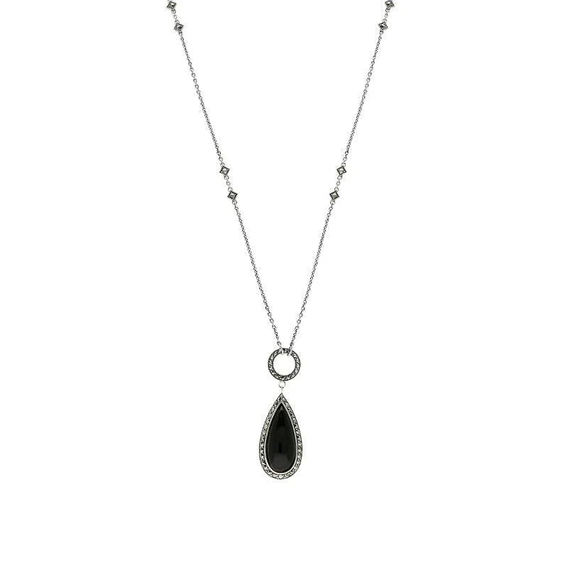 Sterling Silver Whitby Jet Marcasite Pear Drop T-Bar Necklace