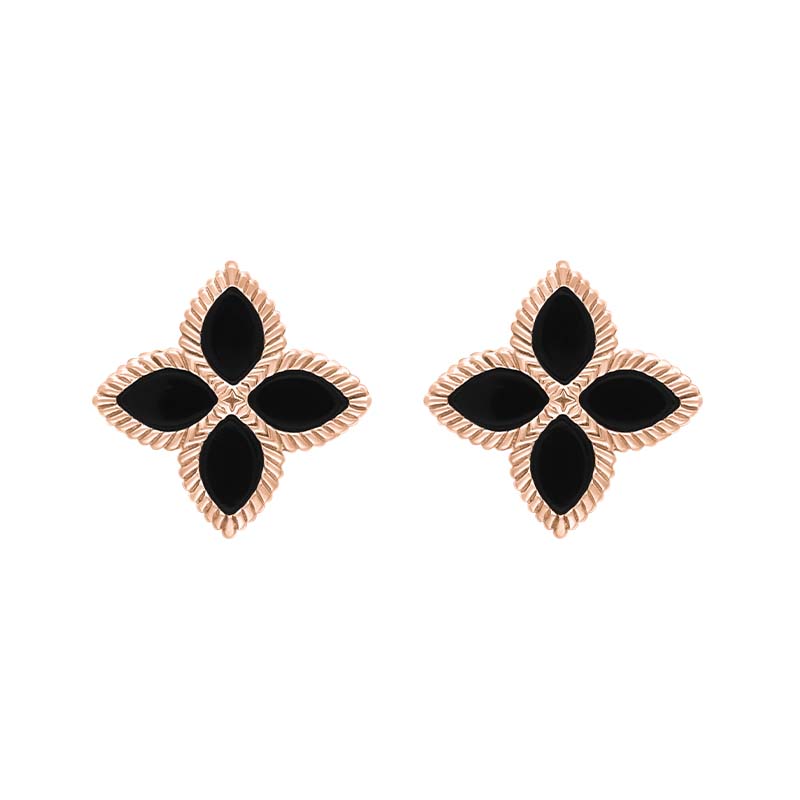 These elegant stud earrings features four stunning marquise shaped cabochons of the finest Whitby Jet stone in the shape of a flower, sourced directly from the north east coast of Yorkshire. The flowers are surrounded with a rope edge detail for a unique, stylish finish. The striking Whitby Jet forms a stunning contrast between the 9ct rose gold rope edge frame, creating the perfect look for every occasion. Presented on post and butterfly fitments for secure wear.