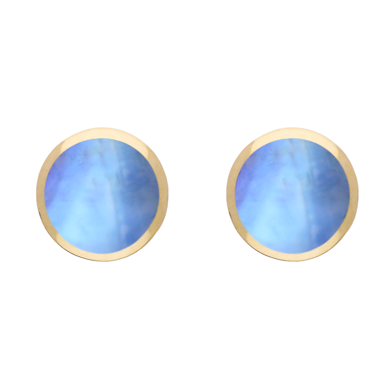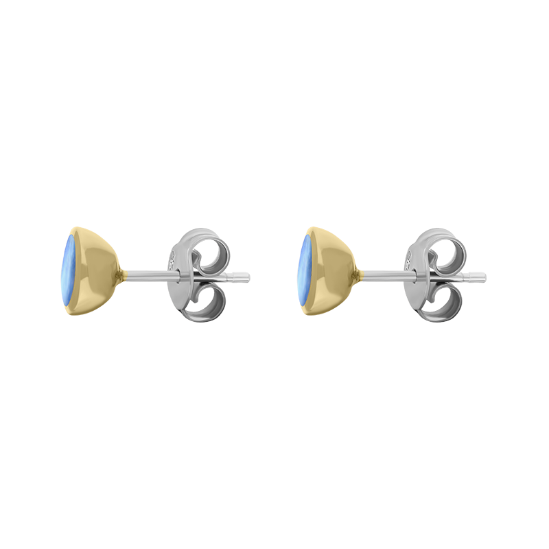 These stud earrings feature highly polished genuine Moonstone set in 9ct yellow gold frames with sterling silver post and butterfly fastenings.
