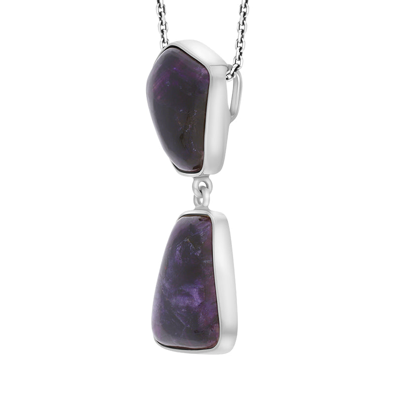 A sophisticated and classic pendant, featuring two Blue John gemstones cut to an abstract pentagon and trapezium design, which is presented on a 18" long sterling silver chain.