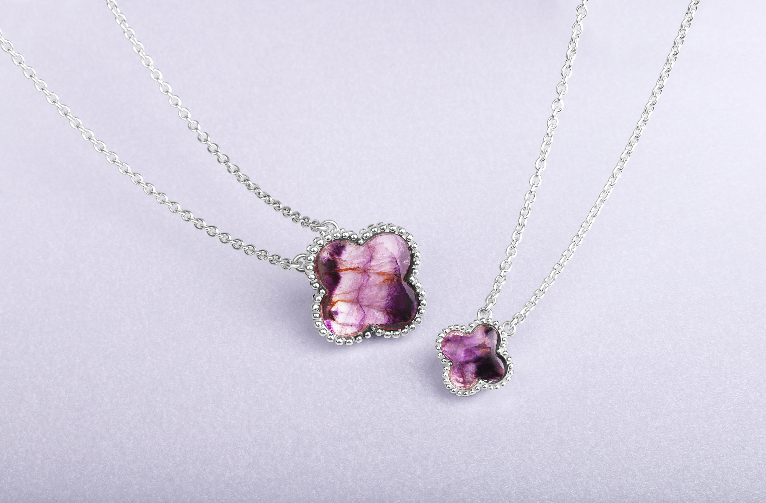 This elegant necklet features a stunning four leaf clover shaped cabochon of the finest Blue John stone, that has been sourced directly from the Derbyshire Blue John Cavern in Castleton. The clover is surrounded with ball detail for a unique, stylish finish. The striking Blue John forms a stunning contrast between the 18 inch sterling silver chain, creating the perfect look for every occasion.