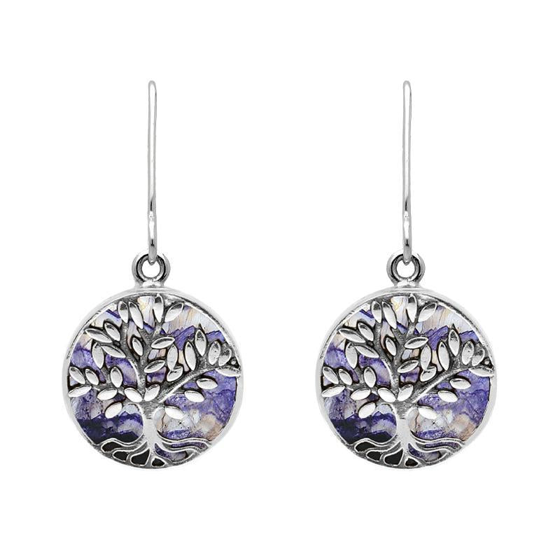 An elegant and unusual design from the Tree of Life collection by Araucaria, this sterling silver and Blue John necklace and drop earring set is perfect for any occasion. Both pieces feature a gorgeous disc of Blue John set within a sterling silver frame, overlaid with a beautiful Tree of Life detail featuring large leaves.