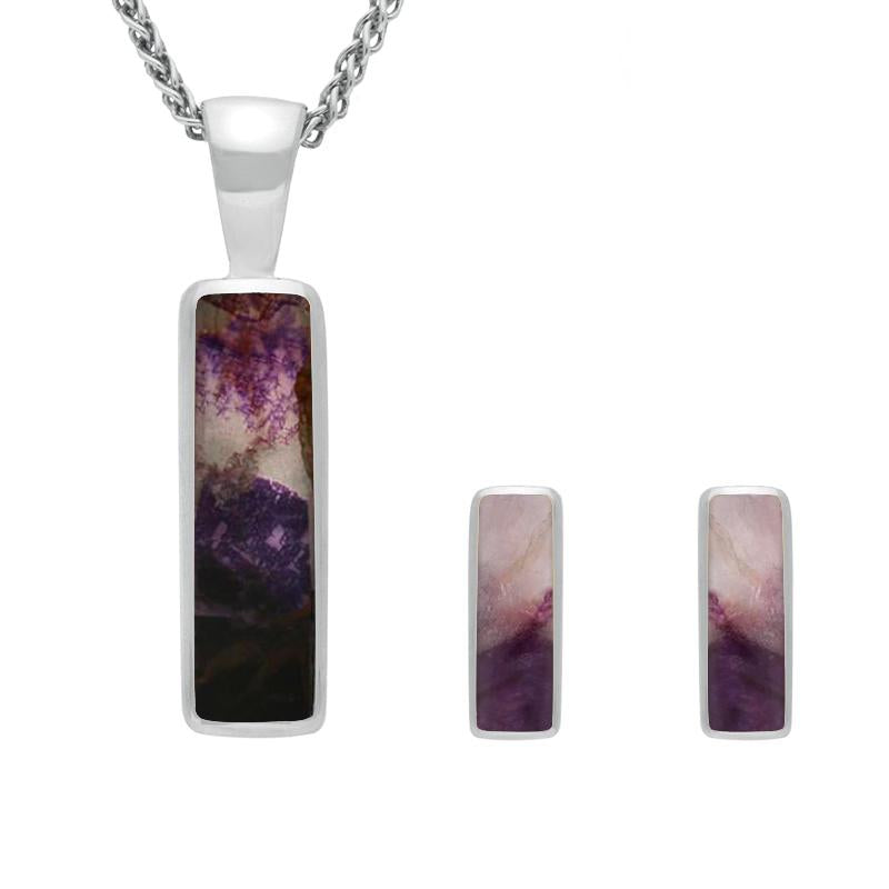 A perfect gift for a loved one, this beautiful sterling silver and Derbyshire Blue John two piece set features a beautifully polished and hand carved oblong shaped Blue John gemstone set in sterling silver. Very slightly rounded at the corners, the design has a softer appearance, and would suit a majority of styles and occasions. Comprising of a pair of stud earrings, and necklace, complete with an 18 inch sterling silver chain. All items can be sold separately.