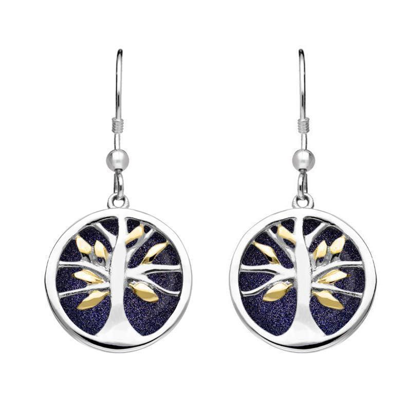 This set of elegant sterling silver and Blue Goldstone drop earrings set within a sterling silver frame, overlaid with a beautiful Tree of Life detail, where the leaves are gold plated. In ancient times the Tree of Life was considered to be a symbol of immortality. The leaves on the tree were thought to have magical properties and elements to heal the soul.