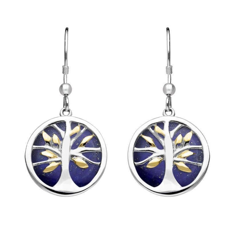 This set of elegant sterling silver and Lapis Lazuli drop earrings set within a sterling silver frame, overlaid with a beautiful Tree of Life detail, where the leaves are gold plated. In ancient times the Tree of Life was considered to be a symbol of immortality. The leaves on the tree were thought to have magical properties and elements to heal the soul.