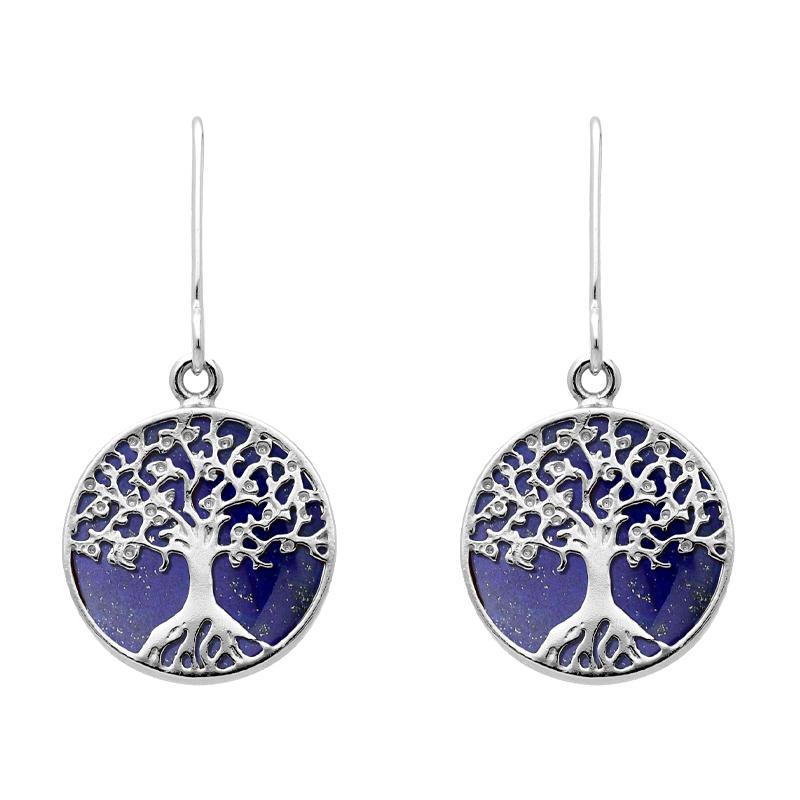 Sterling Silver Lapis Lazuli Round Tree of Life Drop Earrings, E2429.