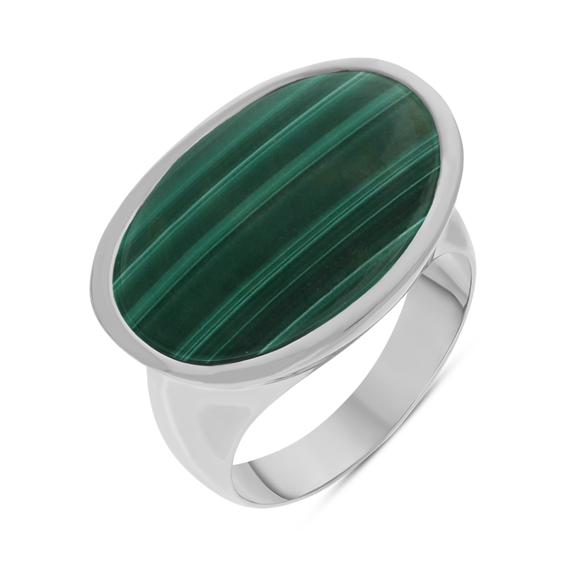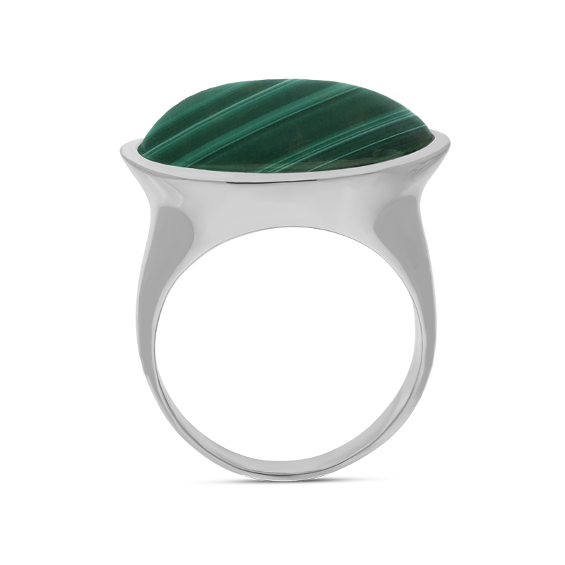 This elegant ring features a stunning oval cabochon of hand carved Malachite. The gemstone is set within an exquisite sterling silver base and completed with a wide statement sterling silver band.