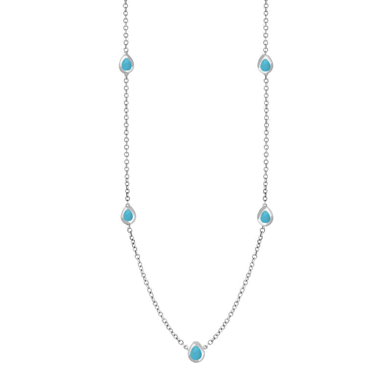 This on trend sterling silver chain necklace features petite discs embellished with cross shaped fine Turquoise stones that have been sourced directly from the North East coast of Yorkshire.