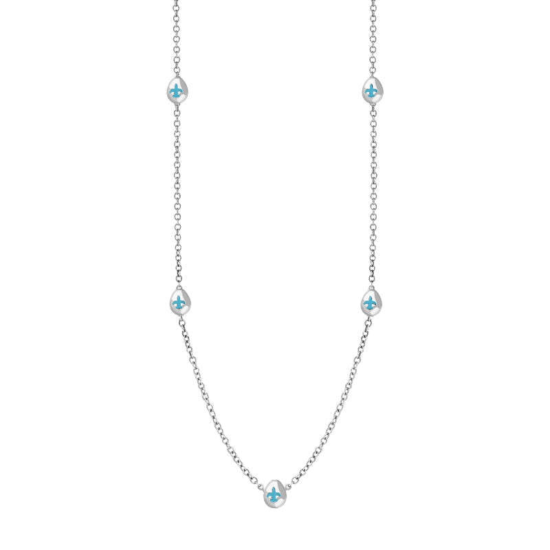This on trend sterling silver chain necklace features petite discs embellished with Fleur De Lis shaped fine Turquoise stones that have been sourced directly from the North East coast of Yorkshire.