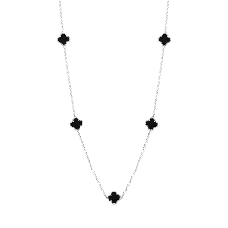 This elegant necklace features five stunning four leaf clover shaped cabochons of the finest Whitby Jet stone, sourced directly from the north east coast of Yorkshire. The clover stations are surrounded with a ball edge detail for a unique, stylish finish. The striking Whitby Jet forms a stunning contrast between the sterling silver frames and 18 inch long chain, creating the perfect look for every occasion.