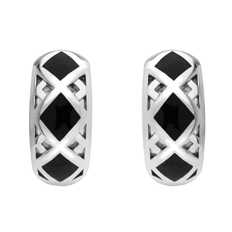 This beautiful two piece set has been created using a brilliant combination of solid sterling silver and the highest quality hand carved Whitby Jet. The geometric style of the pieces creates a brilliant contrast between the endless black of Whitby Jet and the bright shine of the silver. The layers of silver also add depth, and create an overall interesting and contemporary design. Comprising of a pair of hoop earrings and necklace, complete with an 18 inch sterling silver chain. All items can be sold separately.