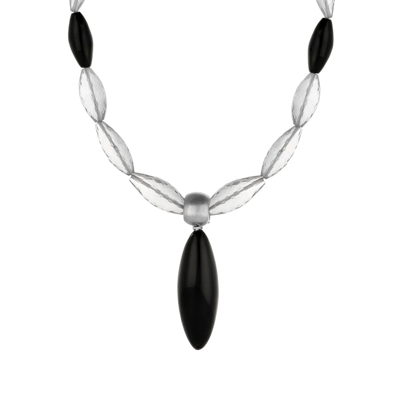 This unique necklace features genuine Whitby Jet and Quartz marquise-shaped beads. Perfect for day to evening wear, the necklace is completed with a decorative sterling silver clasp.