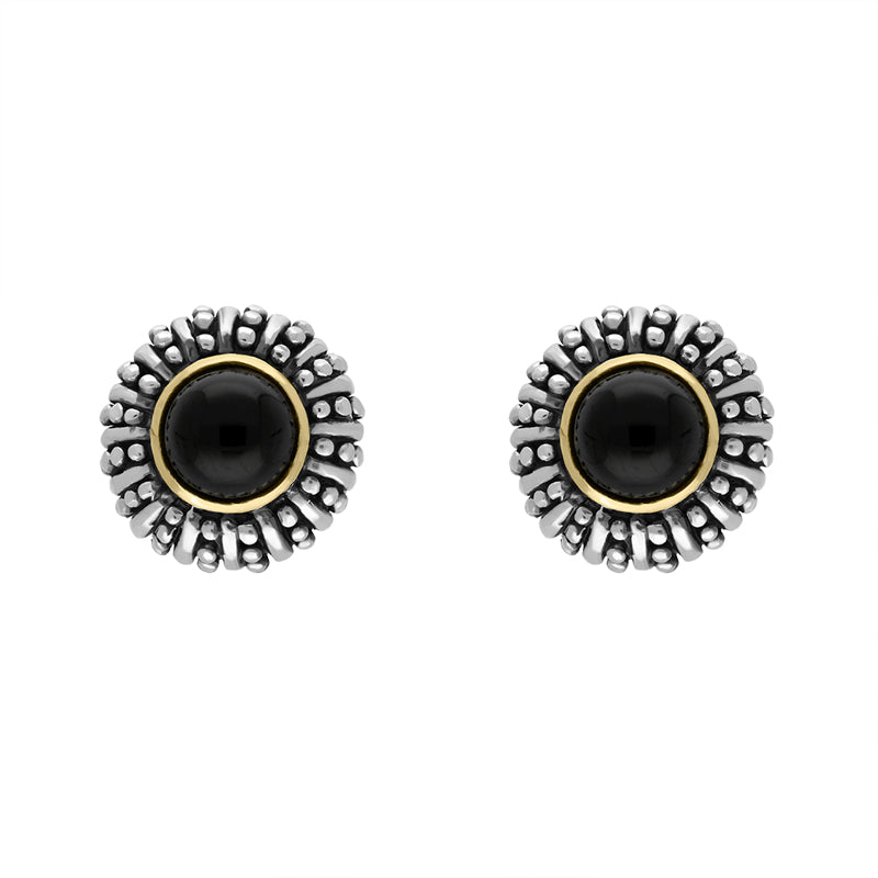 These charming sterling silver earrings, with 18ct yellow gold embellishments, feature the finest Whitby Jet, sourced directly from the north east coast of Yorkshire. The striking Whitby Jet creates a stunning contrast between the sterling silver making the perfect earrings for someone looking for a beautifully unique item of jewellery.
