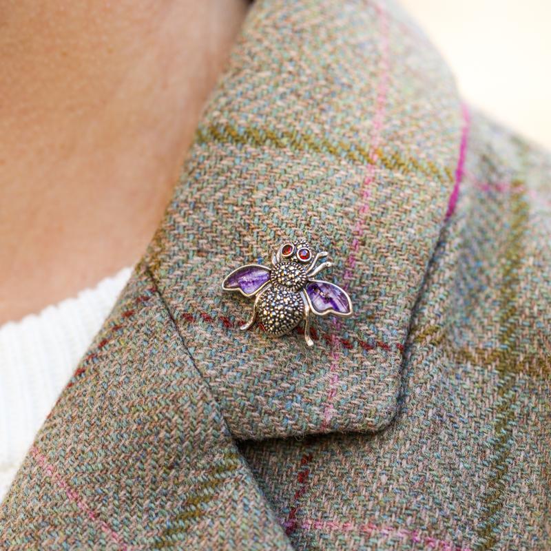 This gorgeous little bee brooch is hand made in Sterling Silver and features beautifully hand carved Blue John gemstones set in the wings, sparkling Marcasite gemstones set in the body, and two stunning Garnet set eyes. This is an exquisite and detailed piece which would make a beautiful gift. The Blue John stone has been directly sourced from Castleton, Derbyshire.