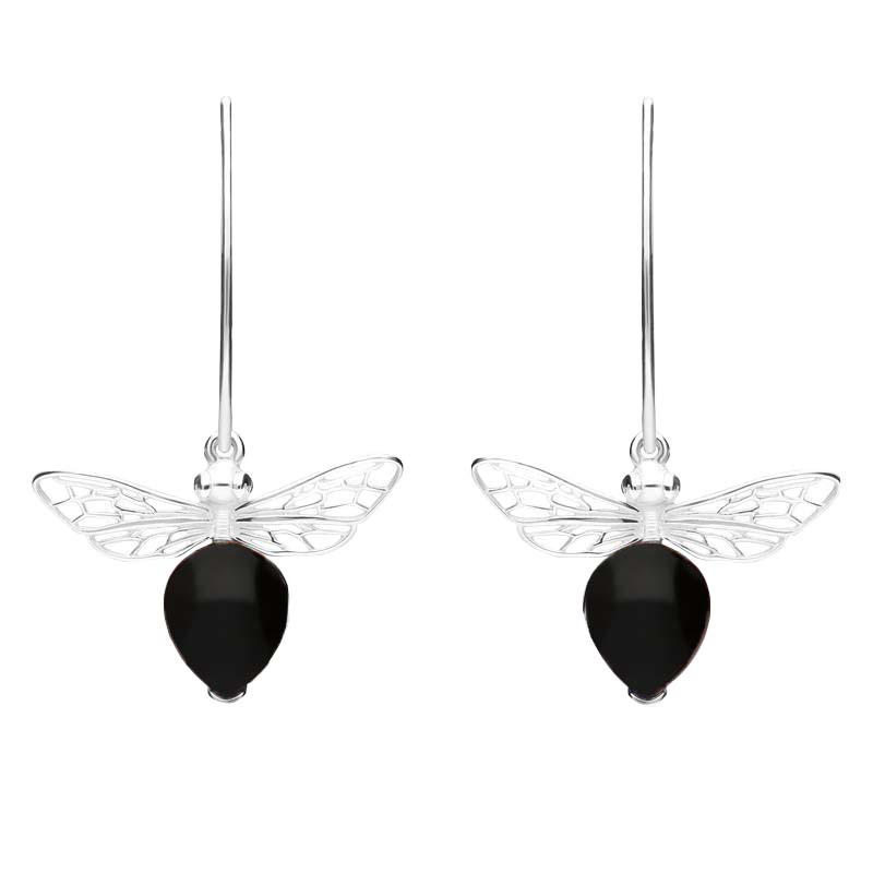 These stunning earrings are a fantastic display of Whitby Jet fashioned into the shape of this delicate bee. These dainty hook earrings have intricate wings made of sterling silver that sit delicately above the body of the bee. Supplied with a sterling silver hook fastenings.